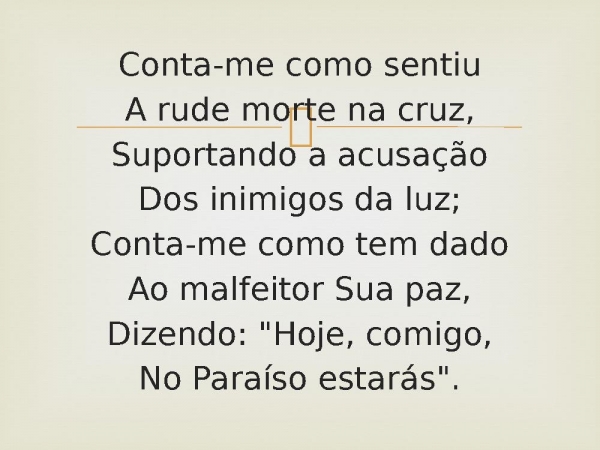 - Conta-me como sentiuA rude morte na cruz,Suportando a acusaçãoDos inimigos da luz;Conta-me como tem dadoAo malfeitor Sua paz,Dizendo: "Hoje, comigo,No Paraíso estarás".