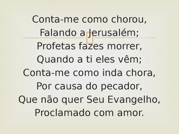 - Conta-me como chorou,Falando a Jerusalém;Profetas fazes morrer,Quando a ti eles vêm;Conta-me como inda chora,Por causa do pecador,Que não quer Seu Evangelho,Proclamado com amor.