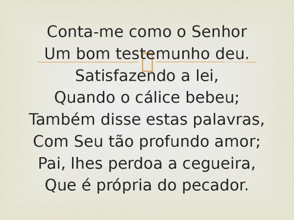 - Conta-me como o SenhorUm bom testemunho deu.Satisfazendo a lei,Quando o cálice bebeu;Também disse estas palavras,Com Seu tão profundo amor;Pai, lhes perdoa a cegueira,Que é própria do pecador.