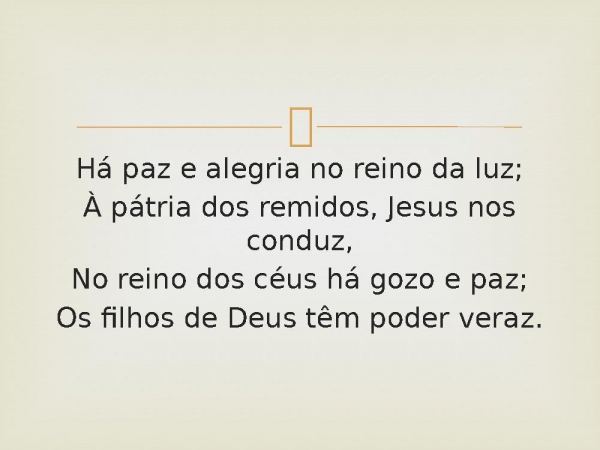 - Há paz e alegria no reino da luz;À pátria dos remidos, Jesus nos conduz,No reino dos céus há gozo e paz;Os filhos de Deus têm poder veraz.