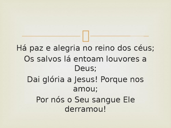 - Há paz e alegria no reino dos céus;Os salvos lá entoam louvores a Deus;Dai glória a Jesus! Porque nos amou;Por nós o Seu sangue Ele derramou!
