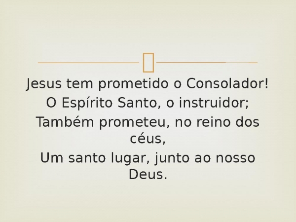 - Jesus tem prometido o Consolador!O Espírito Santo, o instruidor;Também prometeu, no reino dos céus,Um santo lugar, junto ao nosso Deus.