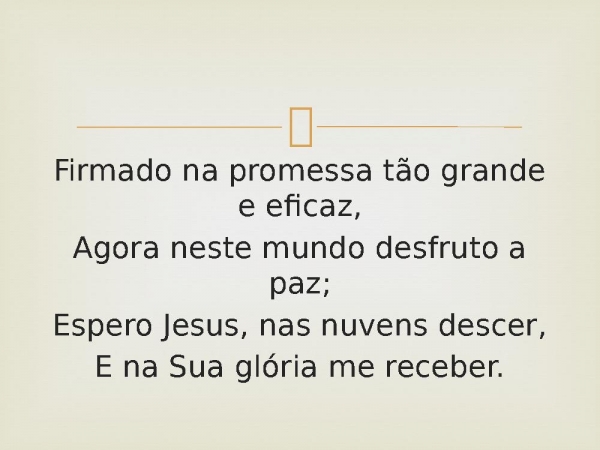 - Firmado na promessa tão grande e eficaz,Agora neste mundo desfruto a paz;Espero Jesus, nas nuvens descer,E na Sua glória me receber.