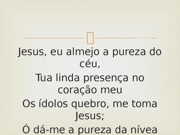 - Jesus, eu almejo a pureza do céu,Tua linda presença no coração meuOs ídolos quebro, me toma Jesus;Ó dá-me a pureza da nívea luz.