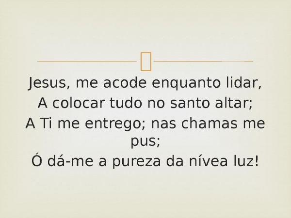 - Jesus, me acode enquanto lidar,A colocar tudo no santo altar;A Ti me entrego; nas chamas me pus;Ó dá-me a pureza da nívea luz!