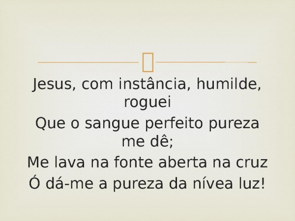 - Jesus, com instância, humilde, rogueiQue o sangue perfeito pureza me dê;Me lava na fonte aberta na cruzÓ dá-me a pureza da nívea luz!