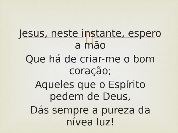 - Jesus, neste instante, espero a mãoQue há de criar-me o bom coração;Aqueles que o Espírito pedem de Deus,Dás sempre a pureza da nívea luz!