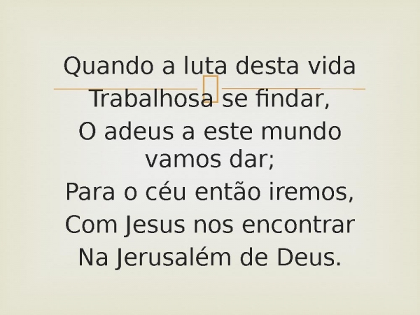 - Quando a luta desta vidaTrabalhosa se findar,O adeus a este mundo vamos dar;Para o céu então iremos,Com Jesus nos encontrarNa Jerusalém de Deus.