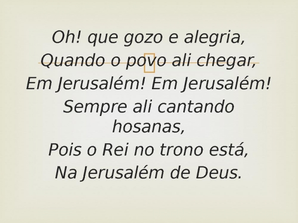 - Oh! que gozo e alegria,Quando o povo ali chegar,Em Jerusalém! Em Jerusalém!Sempre ali cantando hosanas,Pois o Rei no trono está,Na Jerusalém de Deus.