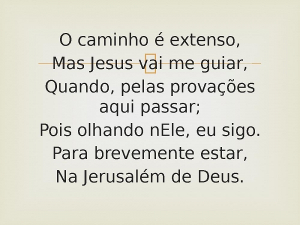 - O caminho é extenso,Mas Jesus vai me guiar,Quando, pelas provações aqui passar;Pois olhando nEle, eu sigo.Para brevemente estar,Na Jerusalém de Deus.