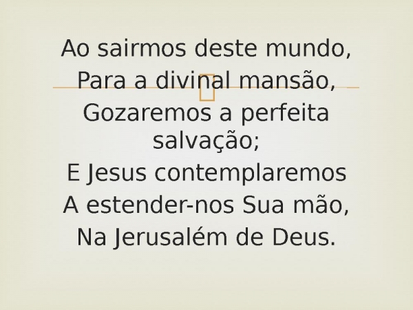 - Ao sairmos deste mundo,Para a divinal mansão,Gozaremos a perfeita salvação;E Jesus contemplaremosA estender-nos Sua mão,Na Jerusalém de Deus.
