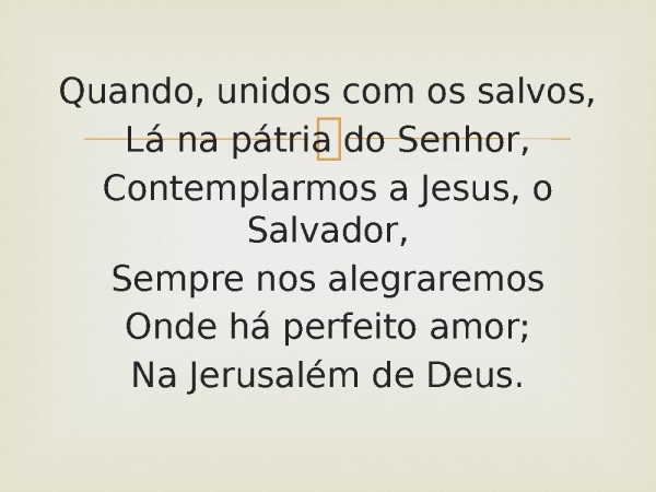 - Quando, unidos com os salvos,Lá na pátria do Senhor,Contemplarmos a Jesus, o Salvador,Sempre nos alegraremosOnde há perfeito amor;Na Jerusalém de Deus.