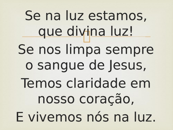 - Se na luz estamos, que divina luz!Se nos limpa sempre o sangue de Jesus,Temos claridade em nosso coração,E vivemos nós na luz.