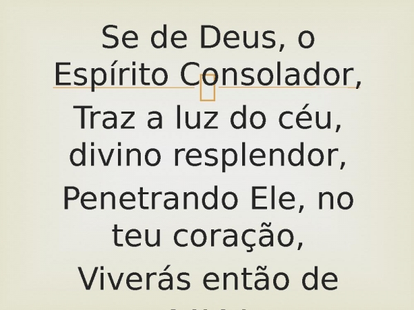 - Se de Deus, o Espírito Consolador,Traz a luz do céu, divino resplendor,Penetrando Ele, no teu coração,Viverás então de amor.