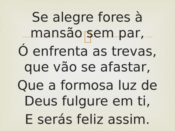 - Se alegre fores à mansão sem par,Ó enfrenta as trevas, que vão se afastar,Que a formosa luz de Deus fulgure em ti,E serás feliz assim.