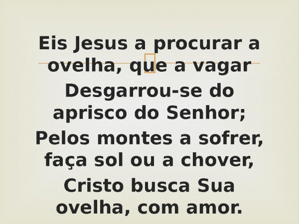 - Eis Jesus a procurar a ovelha, que a vagarDesgarrou-se do aprisco do Senhor;Pelos montes a sofrer, faça sol ou a chover,Cristo busca Sua ovelha, com amor.