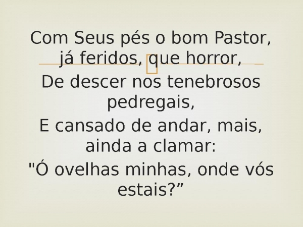 - Com Seus pés o bom Pastor, já feridos, que horror,De descer nos tenebrosos pedregais,E cansado de andar, mais, ainda a clamar:"Ó ovelhas minhas, onde vós estais?”