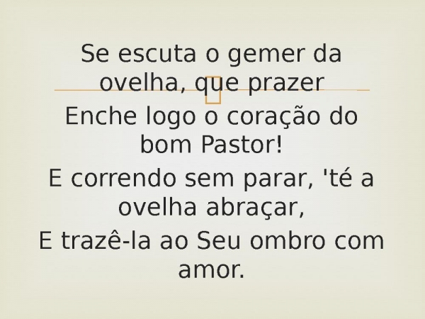 - Se escuta o gemer da ovelha, que prazerEnche logo o coração do bom Pastor!E correndo sem parar, 'té a ovelha abraçar,E trazê-la ao Seu ombro com amor.