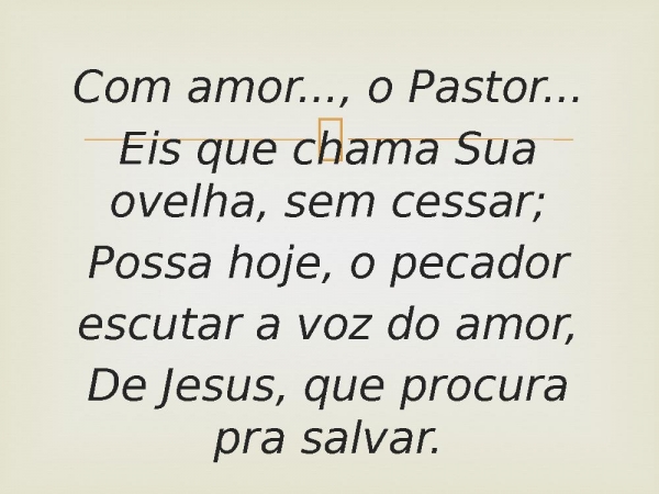 - Com amor..., o Pastor...Eis que chama Sua ovelha, sem cessar;Possa hoje, o pecadorescutar a voz do amor,De Jesus, que procura pra salvar.