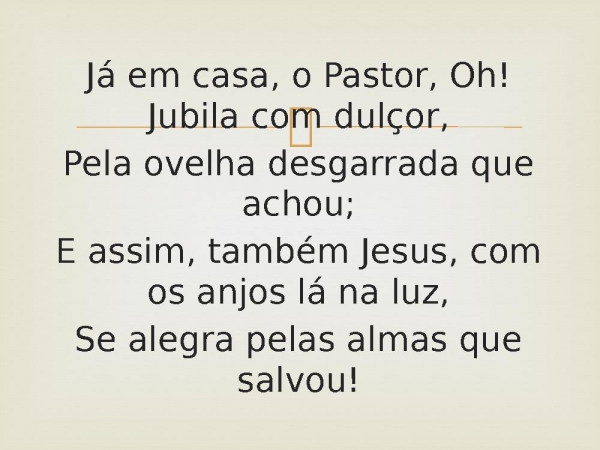 - Já em casa, o Pastor, Oh! Jubila com dulçor,Pela ovelha desgarrada que achou;E assim, também Jesus, com os anjos lá na luz,Se alegra pelas almas que salvou!