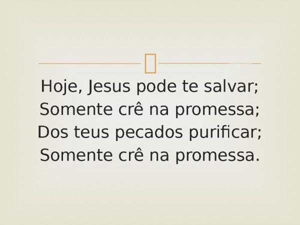 - Hoje, Jesus pode te salvar;Somente crê na promessa;Dos teus pecados purificar;Somente crê na promessa.