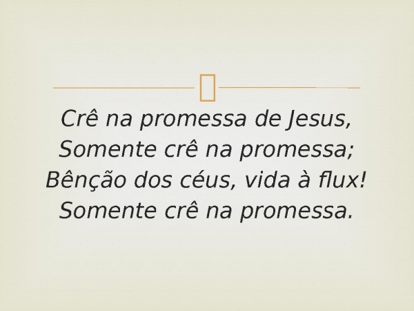 - Crê na promessa de Jesus,Somente crê na promessa;Bênção dos céus, vida à flux!Somente crê na promessa.
