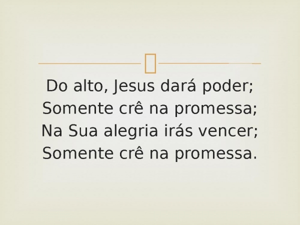 - Do alto, Jesus dará poder;Somente crê na promessa;Na Sua alegria irás vencer;Somente crê na promessa.