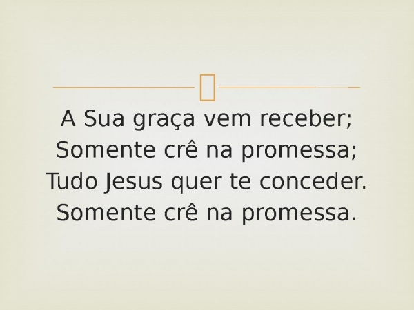 - A Sua graça vem receber;Somente crê na promessa;Tudo Jesus quer te conceder.Somente crê na promessa.