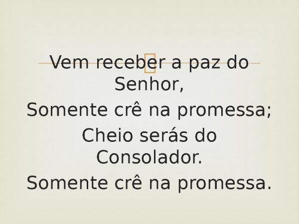 - Vem receber a paz do Senhor,Somente crê na promessa;Cheio serás do Consolador.Somente crê na promessa.