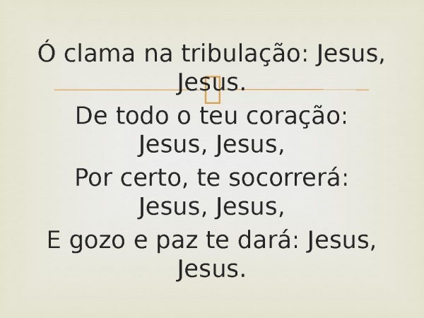 - Ó clama na tribulação: Jesus, Jesus.De todo o teu coração: Jesus, Jesus,Por certo, te socorrerá: Jesus, Jesus,E gozo e paz te dará: Jesus, Jesus.