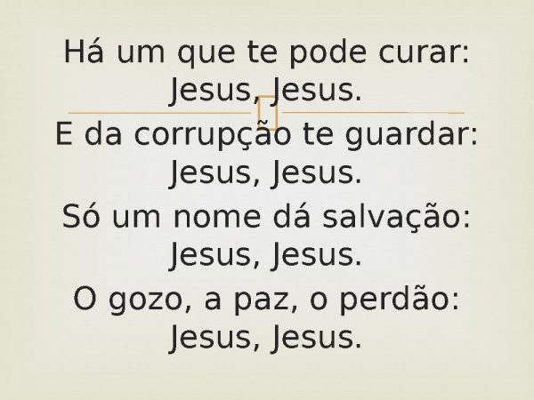 - Há um que te pode curar: Jesus, Jesus.E da corrupção te guardar: Jesus, Jesus.Só um nome dá salvação: Jesus, Jesus.O gozo, a paz, o perdão: Jesus, Jesus.