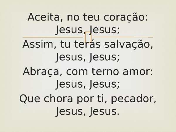 - Aceita, no teu coração: Jesus, Jesus;Assim, tu terás salvação, Jesus, Jesus;Abraça, com terno amor: Jesus, Jesus;Que chora por ti, pecador, Jesus, Jesus.