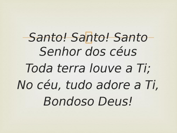 - Santo! Santo! Santo Senhor dos céusToda terra louve a Ti;No céu, tudo adore a Ti,Bondoso Deus!
