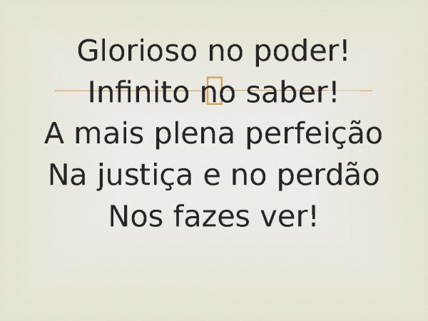 - Glorioso no poder!Infinito no saber!A mais plena perfeiçãoNa justiça e no perdãoNos fazes ver!