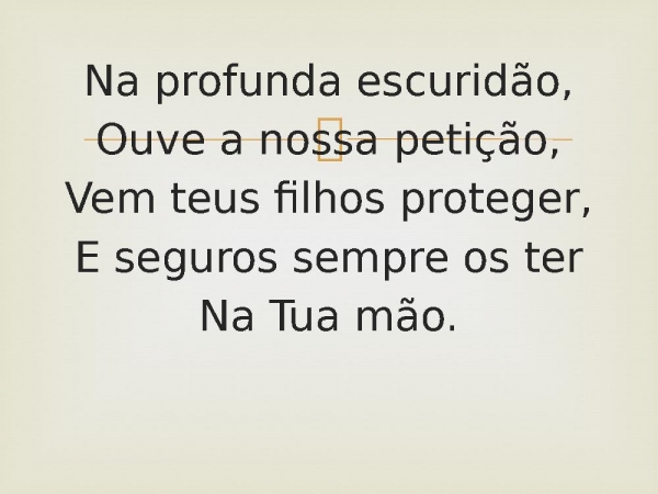 - Na profunda escuridão,Ouve a nossa petição,Vem teus filhos proteger,E seguros sempre os terNa Tua mão.