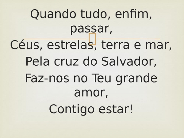 - Quando tudo, enfim, passar,Céus, estrelas, terra e mar,Pela cruz do Salvador,Faz-nos no Teu grande amor,Contigo estar!