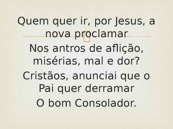 - Quem quer ir, por Jesus, a nova proclamarNos antros de aflição, misérias, mal e dor?Cristãos, anunciai que o Pai quer derramarO bom Consolador.