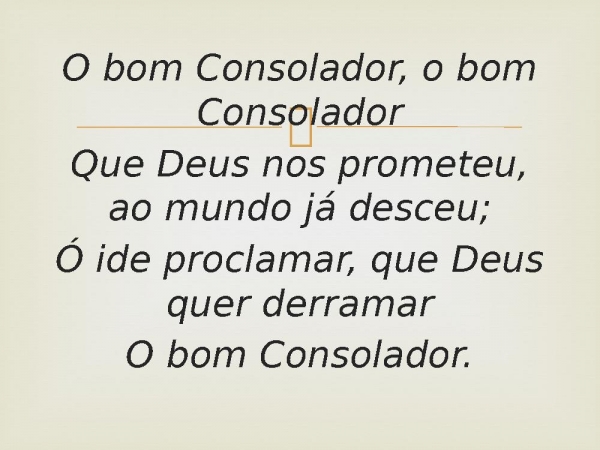 - O bom Consolador, o bom ConsoladorQue Deus nos prometeu, ao mundo já desceu;Ó ide proclamar, que Deus quer derramarO bom Consolador.