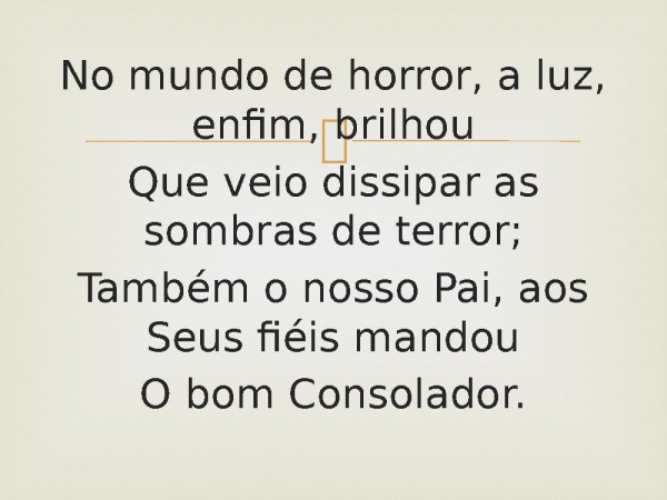 - No mundo de horror, a luz, enfim, brilhouQue veio dissipar as sombras de terror;Também o nosso Pai, aos Seus fiéis mandouO bom Consolador.