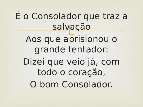 - É o Consolador que traz a salvaçãoAos que aprisionou o grande tentador:Dizei que veio já, com todo o coração,O bom Consolador.