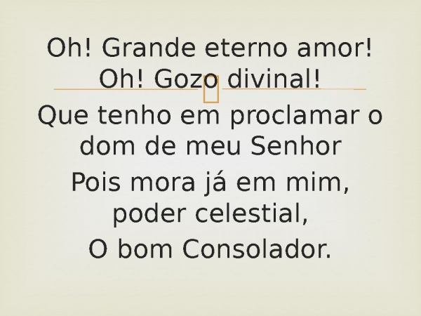 - Oh! Grande eterno amor! Oh! Gozo divinal!Que tenho em proclamar o dom de meu SenhorPois mora já em mim, poder celestial,O bom Consolador.