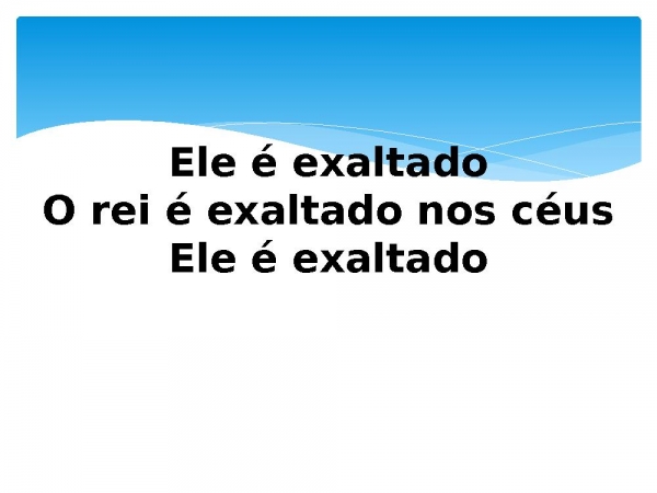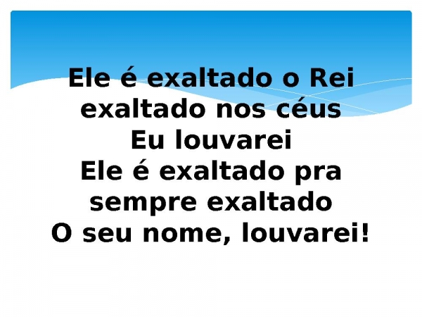 - Ele é exaltado o Rei exaltado nos céusEu louvareiEle é exaltado pra sempre exaltadoO seu nome, louvarei!