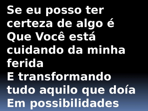 - Se eu posso ter certeza de algo éQue Você está cuidando da minha feridaE transformando tudo aquilo que doíaEm possibilidades para salvar vidas