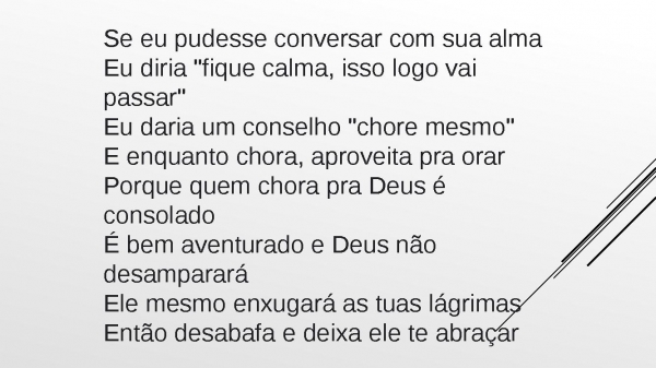 - Se eu pudesse conversar com sua almaEu diria "fique calma, isso logo vai passar"Eu daria um conselho "chore mesmo"E enquanto chora, aproveita pra orarPorque quem chora pra Deus é consoladoÉ bem aventurado e Deus não desampararáEle mesmo enxugará as tuas lágrimasEntão desabafa e deixa ele te abraçar