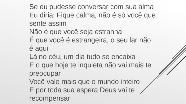 - Se eu pudesse conversar com sua almaEu diria: Fique calma, não é só você que sente assimNão é que você seja estranhaÉ que você é estrangeira, o seu lar não é aquiLá no céu, um dia tudo se encaixaE o que hoje te inquieta não vai mais te preocuparVocê vale mais que o mundo inteiroE por toda sua espera Deus vai te recompensar