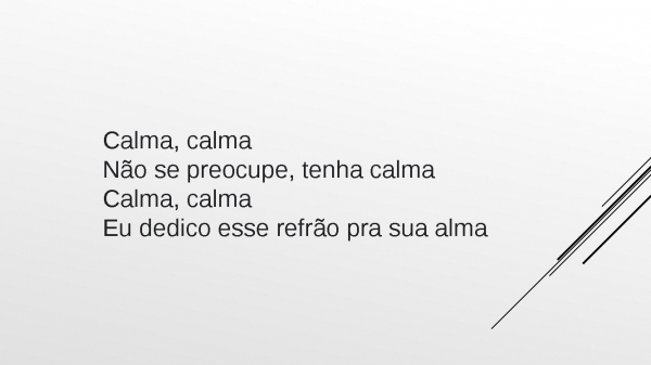 - Calma, calmaNão se preocupe, tenha calmaCalma, calmaEu dedico esse refrão pra sua alma