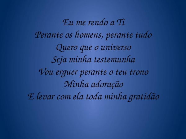 - Eu me rendo a TiPerante os homens, perante tudoQuero que o universoSeja minha testemunhaVou erguer perante o teu tronoMinha adoraçãoE levar com ela toda minha gratidão