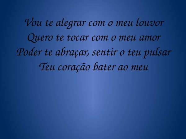 - Vou te alegrar com o meu louvorQuero te tocar com o meu amorPoder te abraçar, sentir o teu pulsarTeu coração bater ao meu