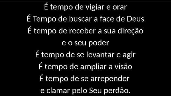 - É tempo de vigiar e orarÉ Tempo de buscar a face de DeusÉ tempo de receber a sua direçãoe o seu poderÉ tempo de se levantar e agirÉ tempo de ampliar a visãoÉ tempo de se arrepender e clamar pelo Seu perdão.