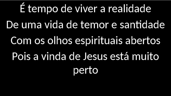 - É tempo de viver a realidadeDe uma vida de temor e santidadeCom os olhos espirituais abertosPois a vinda de Jesus está muito perto